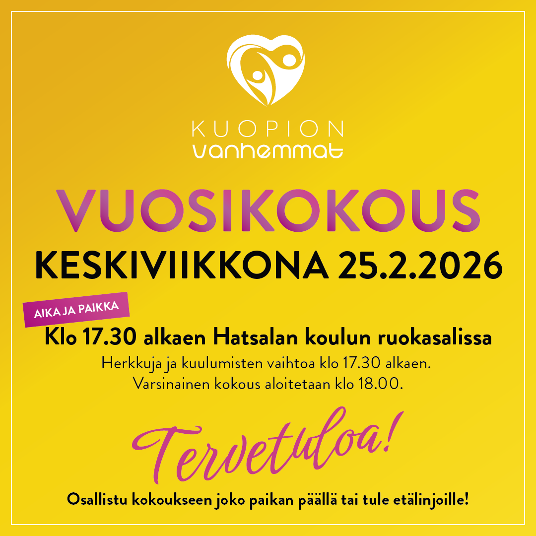 Tervetuloa Kuopion Vanhemmat ry:n vuosikokoukseen 25.2.2026! Kaikki vanhempaintoiminnasta kiinnostuneet sekä tietysti jäsenyhdistystemme toimijat ja henkilöjäsenemme ovat tervetulleita mukaan…